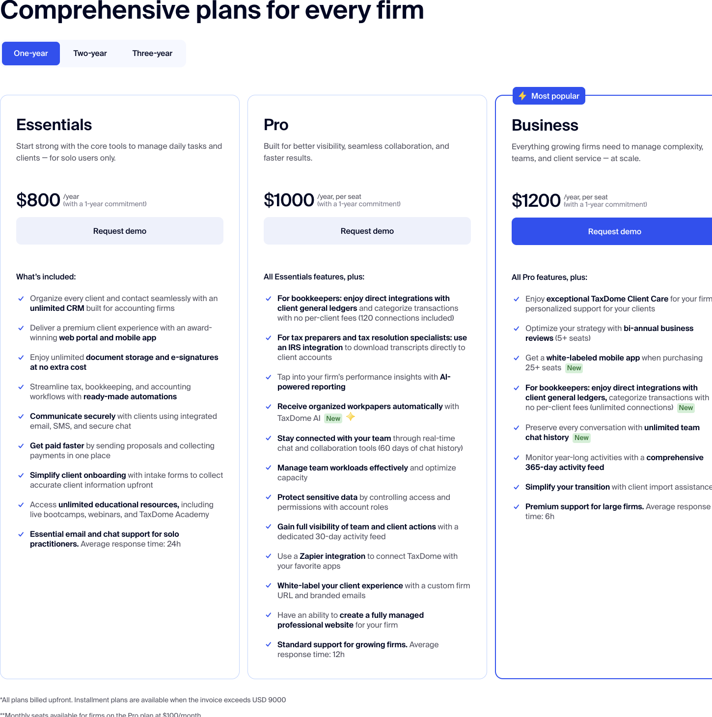TaxDome offers multi-tier plans tailored for firms of different sizes, with discounts available for longer-term commitments.